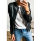 Black Faux Leather Pockets Round Neck Zipper Jacket