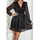 Black Glitter Mesh Overlay V Neck Long Sleeve Dress