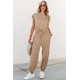 Light French Beige Cap Sleeve Open Back Drawstring Jogger Jumpsuit
