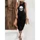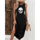 Vintage-Inspired Sleeveless Dress with Halloween Skull Print - Adult Size, Knit Fabric, Polyester Bl